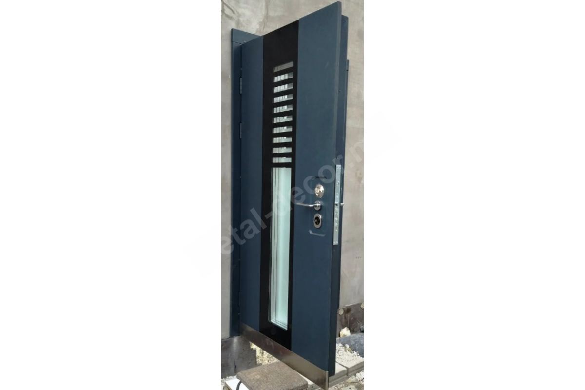 Тепло- шумоизоляция. Полотно толщиной от 127 мм (зависит от выбранного декора: МДФ ламинированный ПВХ, HPL, покраска) и рама толщиной 240 мм. Заполнение полотна: фольгированный изолон 5 мм + пенопласт 40 мм (плотность 18 кг/м3) + пробковый лист толщиной 2 мм + фольгированный изолон 5 мм + пенопласт 40 мм (плотность 18 кг/м3). Рама и полотно с терморазрывом (состоят из двух частей — внутренней и внешней). Внешняя и внутренняя части коробки соединены болтами через слой пробкового дерева 5мм , что препятствует возникновению «мостиков холода». Три контура уплотнения – дополнительная защита от шума, а также, надежная защита от сквозняков. Дизайн. В базовой комплектации внешняя и внутренняя панель МДФ толщиной 16 мм. Так как модель заказная, дизайн может быть любым из имеющихся на данный момент уличных моделей дверей